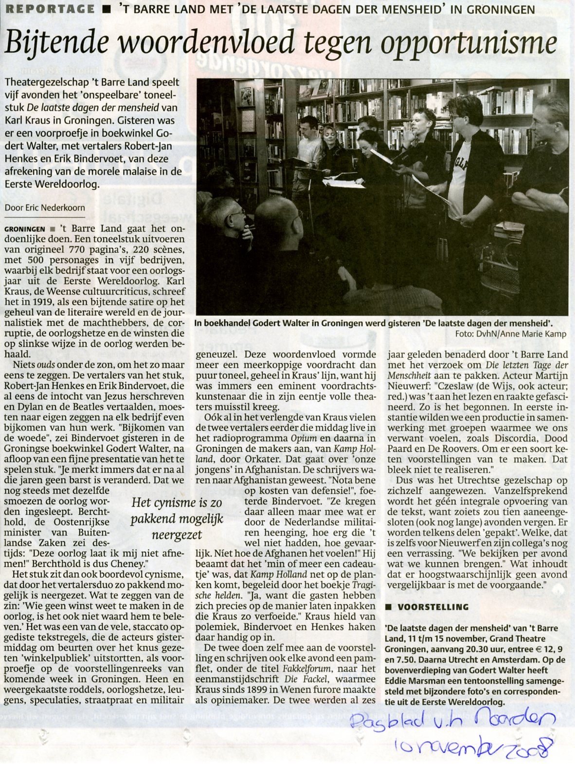 Boekhandel Godert Walter hield afgelopen zondagmiddag een presenatie van De laatste dagen der mensheid. Eric Nederkoorn van het Dagblad van het Noorden deed verslag, in bijlage een scan van het knipsel.